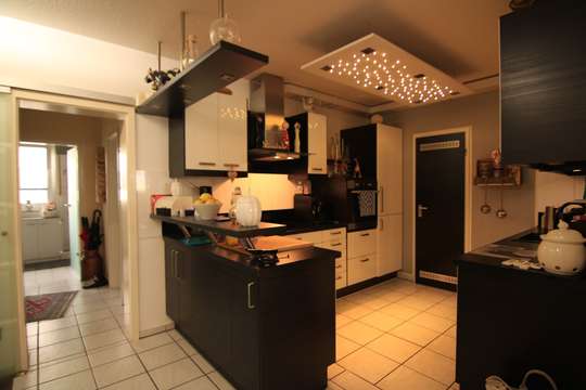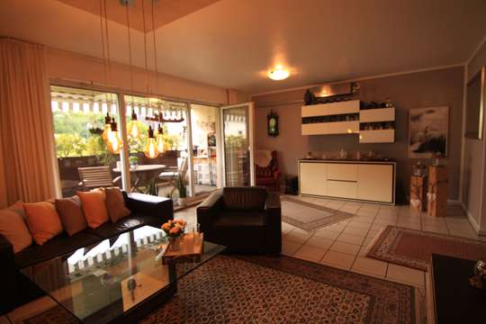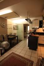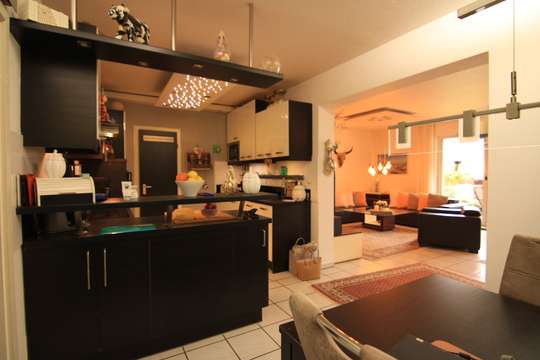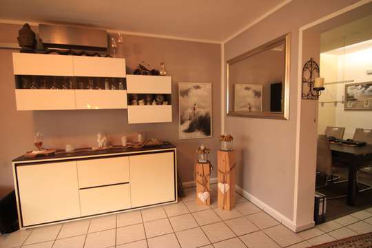Zum Wohnzimmer gelangen sie, wenn Sie die offene Küche mit einem kleinen kombinierten Esszimmer durchqueren. Dieser Bereich ist über eine Glastüre zur Diele verschließbar. Die Küche verfügt über einen praktischen Abstellraum.