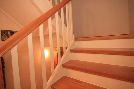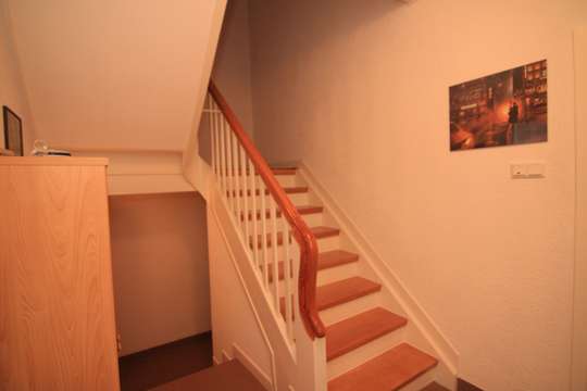 Vor dem eigentlichen Wohnungseingang befindet sich der Aufgang in das Dachgeschoss und ein kleiner Garderobenbereich nebst dem Sicherungskasten.