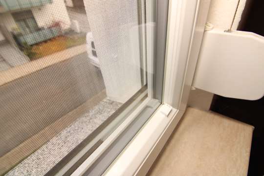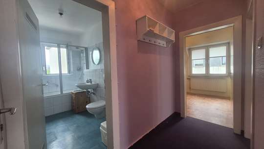 Wenn Sie die Wohnung betreten, befindet sich zur linken Seite ein Badezimmer mit Duschwanne und einem Tageslichtfenster. Gegenüberliegend ist eines der beiden Schlafzimmer. Die Schlafzimmer haben beide neue Fenster, mit Jalousien und haben ungefähr beide dieselbe Größe.