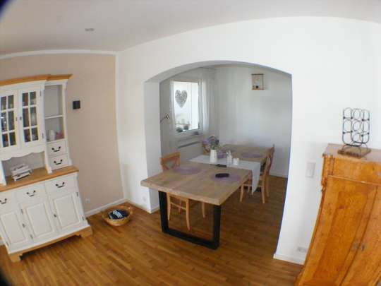 Mit dem Entree verbunden ist eine Gästetoilette für den Besuch. Der Blick voraus, geht in den Wohnbereich, welcher durch Echt-Holzboden und ländlichem Flair besticht. Angrenzend befindet sich ein leicht separiertes Esszimmer mit Fenster und eigenem Ausgang in den Garten. Die moderne und helle Küche befindet sich im vorderen Teil des Gebäudes, welche von sogar zwei Seiten begehbar ist. Neben der Küche befindet sich ein Wintergarten, mit einer großen Fensterfront. Im rechten Teil des Hauses, ruhig gelegen, befindet sich das Elternschlafzimmer, mit einem eigenen separaten Badezimmer.