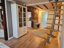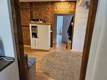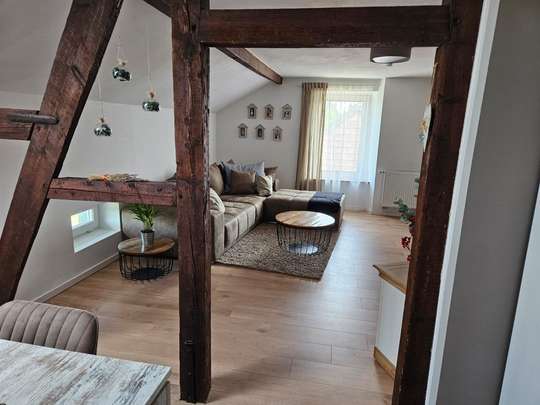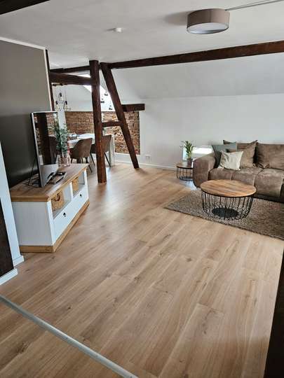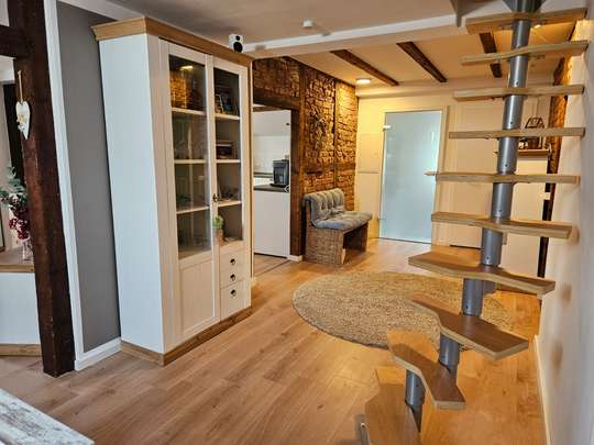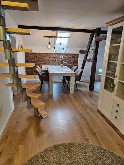 Die gesamte Wohnung ist hell und lichtdurchflutet und bietet mit dem offenen Gebälk und dem frei gelegten Mauerwerk eine einmalige Optik.