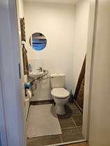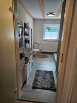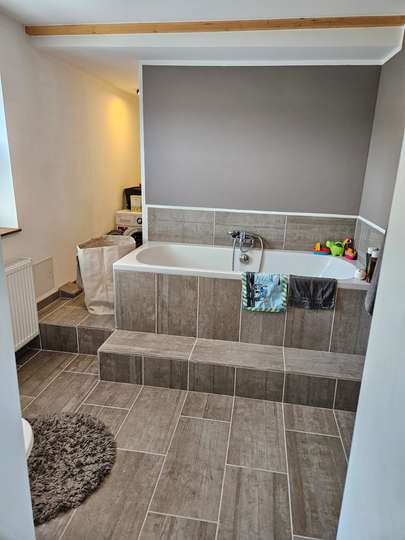 Das helle Tageslicht-Badezimmer verfügt über eine Badewanne mit separater Dusche, einer Toilette und einem Anschluss für die Waschmaschine.