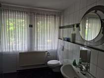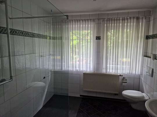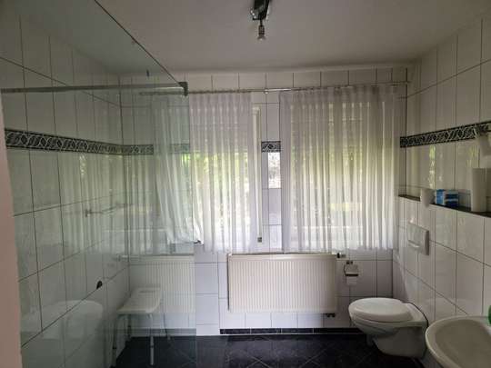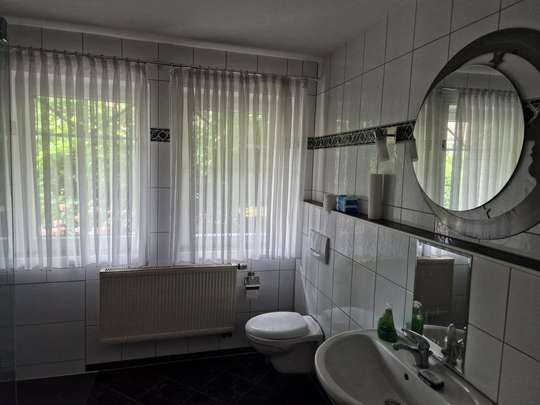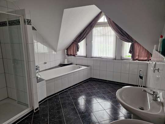 Das riesige und umfänglich ausgestattete Badezimmer, ist gut zugänglich für alle Räume im Obergeschoss. Das Badezimmer verfügt über eine Dusche, sowie einer Badewanne und zwei Waschbecken.