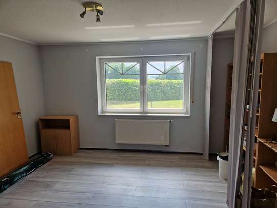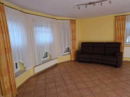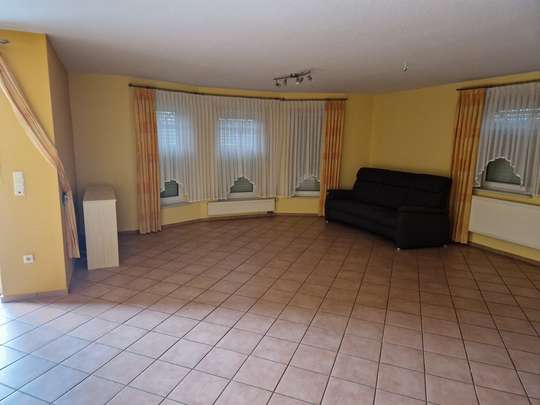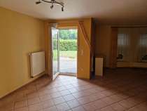 Rückwärtig zum Haus liegt das große Wohnzimmer, mit integriertem Essbereich. Hier befindet sich ebenfalls ein Zugang zur Terasse mit einem schönen großflächigen Blick in den Garten. Über die Terasse gelangen Sie in auch in die angrenzende Garage bzw. den Geräteraum hinter der Garage.