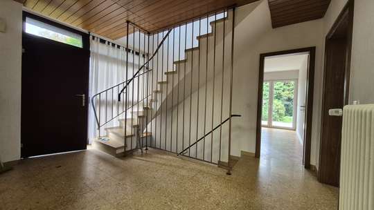 Die untere Ebene, ist mit einem Echtholz Böden ausgestattet. Über das zentral gelegene Treppenhaus, gelangen Sie bequem in jeden Bereich von dem Haus