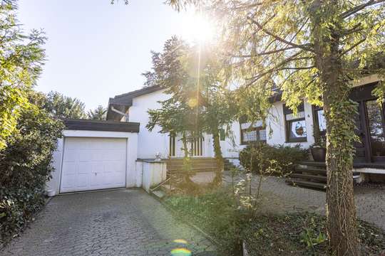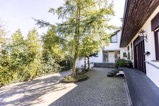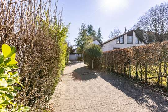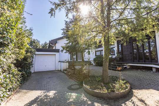 Eine private Zufahrt führt zum Eingangsbereich, wo Sie einen nahezu ebenerdigen Stellplatz vorfinden. Alternativ können Sie in der geräumigen Garage parken, die Platz für bis zu zwei Fahrzeuge bietet und von hier aus den direkten Zugang zum Haus nutzen.