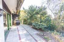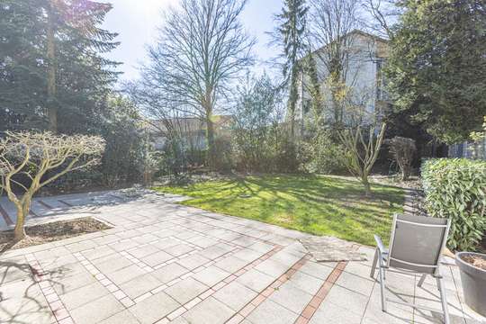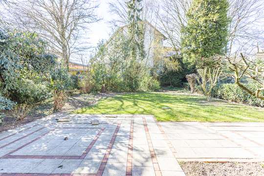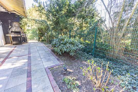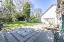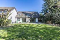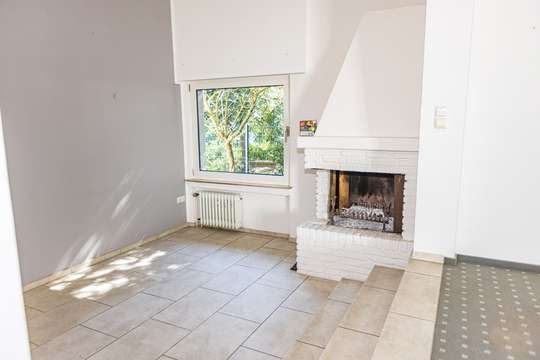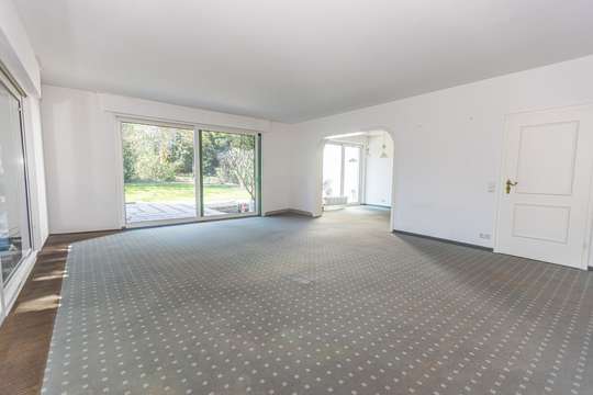 Das großzügige Wohnzimmer (ca. 40 m²) mit anschließendem, klassisch abgesenktem Kaminzimmer eröffnet durch große Fensterflächen eine einladende Aussicht ins Grüne. Von hier aus gelangen Sie direkt zur weitläufigen, über 25 Meter langen Terrasse – einem idealen Ort für gemütliche Morgenstunden mit Kaffee oder geselligen Abenden unter freiem Himmel.