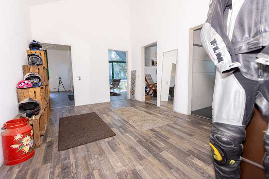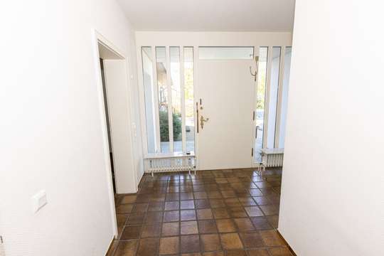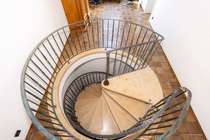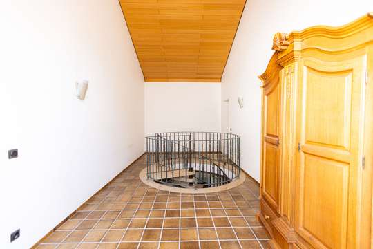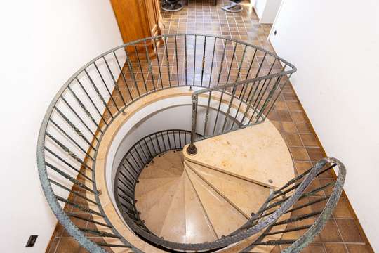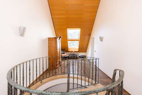 Im Eingangsbereich finden Sie neben einem Garderobenraum eine handwerklich sensationell gestaltete Treppe, über die Sie wahlweise ins Obergeschoss oder in den Keller gelangen.