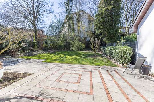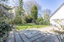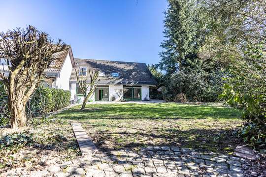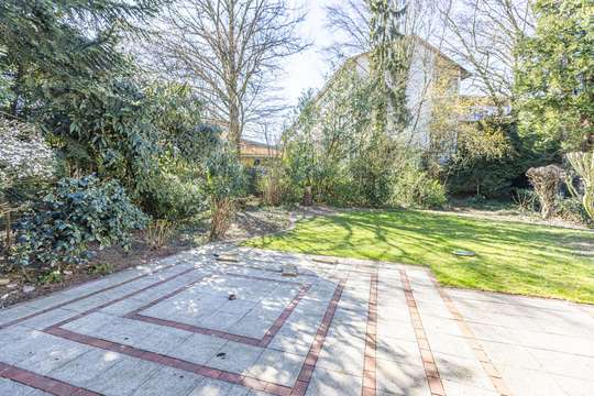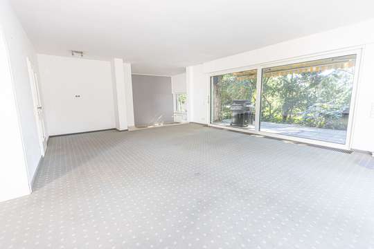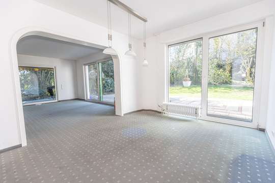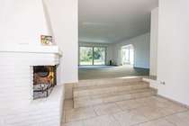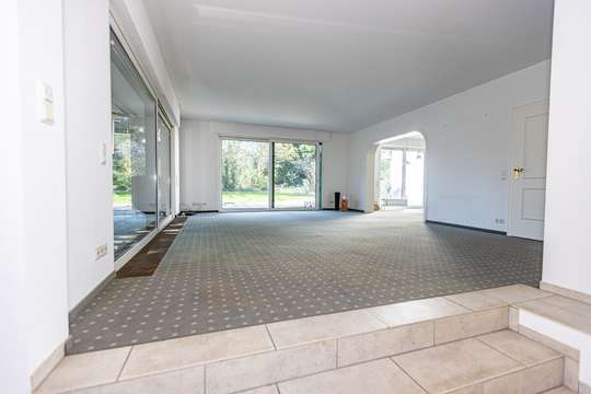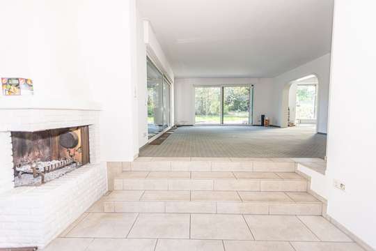 Das großzügige Wohnzimmer (ca. 40 m²) mit anschließendem, klassisch abgesenktem Kaminzimmer eröffnet durch große Fensterflächen eine einladende Aussicht ins Grüne. Von hier aus gelangen Sie direkt zur weitläufigen, über 25 Meter langen Terrasse – einem idealen Ort für gemütliche Morgenstunden mit Kaffee oder geselligen Abenden unter freiem Himmel.