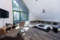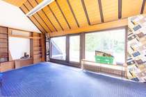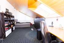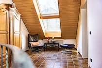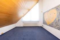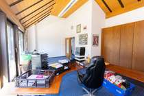 Die rechte Einheit eignet sich ideal als Büro mit einem geräumigen Chefzimmer, das alternativ auch als Wohnzimmer genutzt werden könnte und über einen eigenen Balkon sowie einer architektonisch besonders geformten Deckenhöhe verfügt. Zusätzlich bietet dieser Bereich zwei weitere potenzielle Arbeitsräume. In den Dachschrägen wurde zudem ein clever integrierter Raum geschaffen, der sich als Lagerraum oder Spielbereich für Kinder eignet.