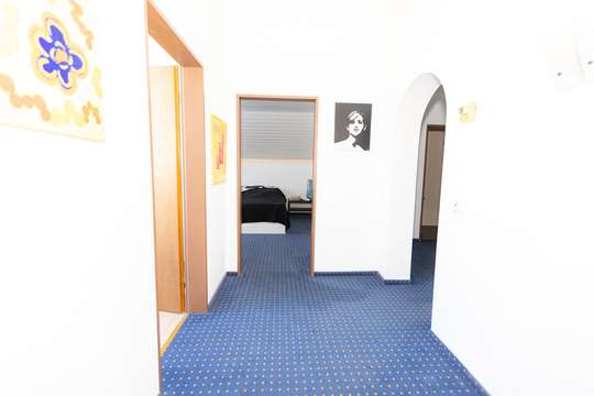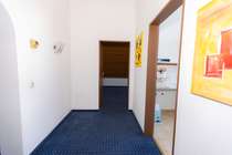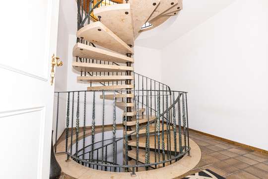 Im Eingangsbereich finden Sie neben einem Garderobenraum eine handwerklich sensationell gestaltete Treppe, über die Sie wahlweise ins Obergeschoss oder in den Keller gelangen.