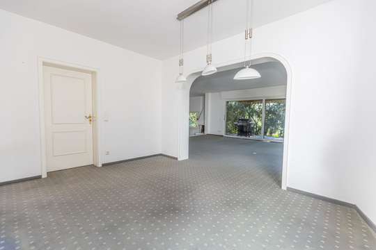 Über die Diele erreichen Sie wahlweise das Esszimmer oder das Wohnzimmer. Die bodentiefen Fenster sorgen in beiden Räumen für eine helle Atmosphäre und bieten jeweils einen separaten Zugang zum Garten. Unmittelbar vom Esszimmer aus zugänglich befindet sich die Küche mit genügend Fläche für Ihre Küchenideen und funktionalen Anforderungen.