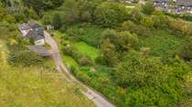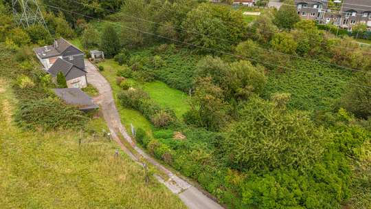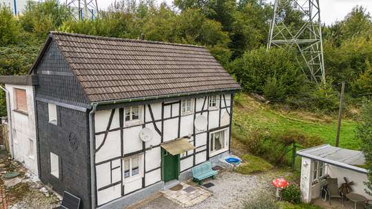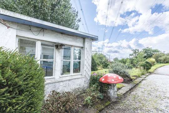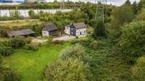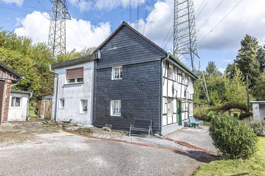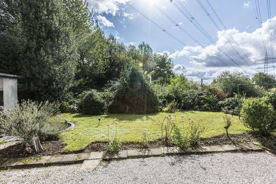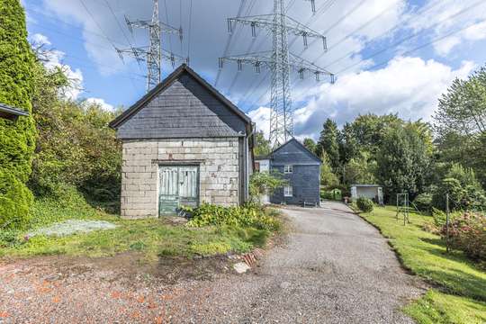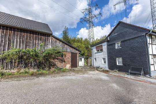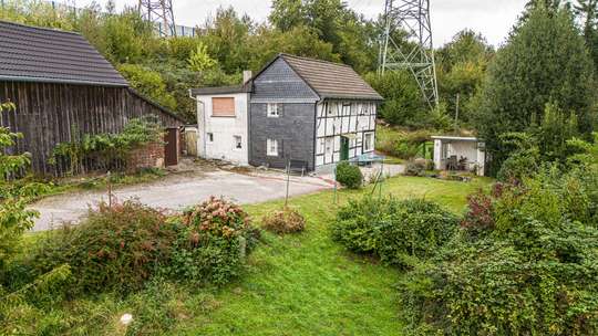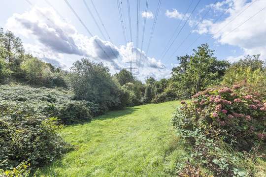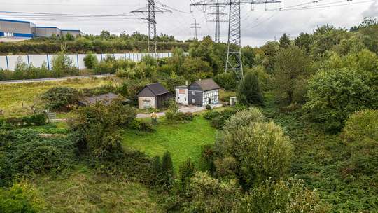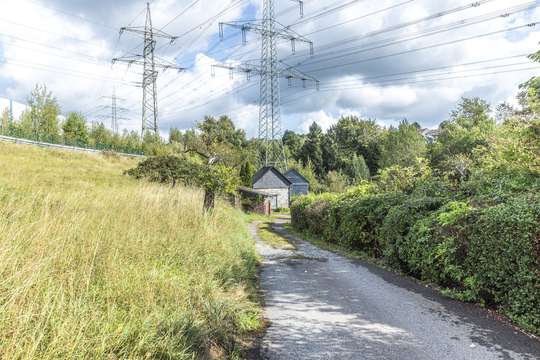 Die Lage verbindet ländliche Ruhe mit einer guten Anbindung an die Stadt. Die Autobahn ist sehr nah, aber durch den geologischen Höhenunterschied kaum zu hören. Die Stromleitungen, die über das Grundstück führen, sorgen für eine besondere Industrieromantik.